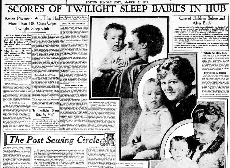 “All she [Lita] asked was that nothing should "hurt" her: she had the blind dread of physical pain common also to most of the young women of her set. But all that was so easily managed nowadays: Mrs. Manford (who took charge of the business, Lita being an orphan) of course knew the most perfect "Twilight Sleep" establishment in the country, installed Lita in its most luxurious suite, and filled her rooms with spring flowers, hot-house fruits, new novels and all the latest picture-papers and Lita drifted into motherhood as lightly and unperceivingly as if the wax doll which suddenly appeared in the cradle at her bedside had been brought there in one of the big bunches of hot-house roses that she found every morning on her pillow.”